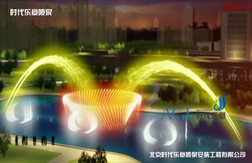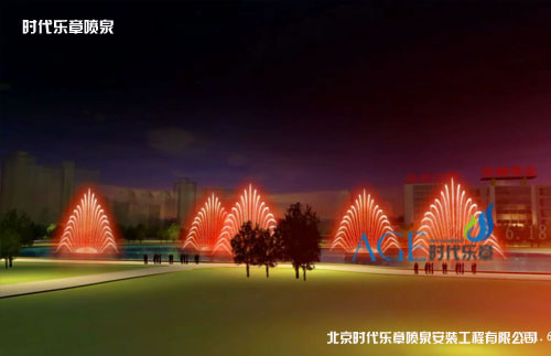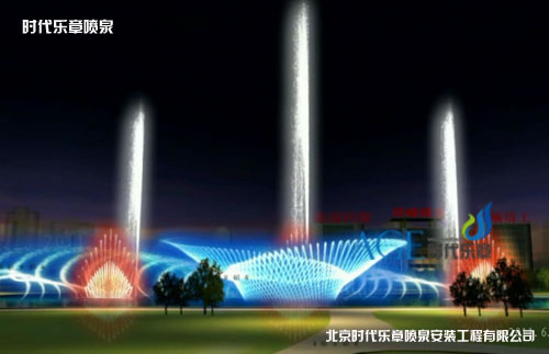 吉祥尊貴的水型,5組水型,分別布置在噴泉的前后,噴高4米,構成逐漸 展開的水形,形似孔雀開屏,在變頻器的控制下,可隨音樂節拍跳動,造型優美而富有動感。